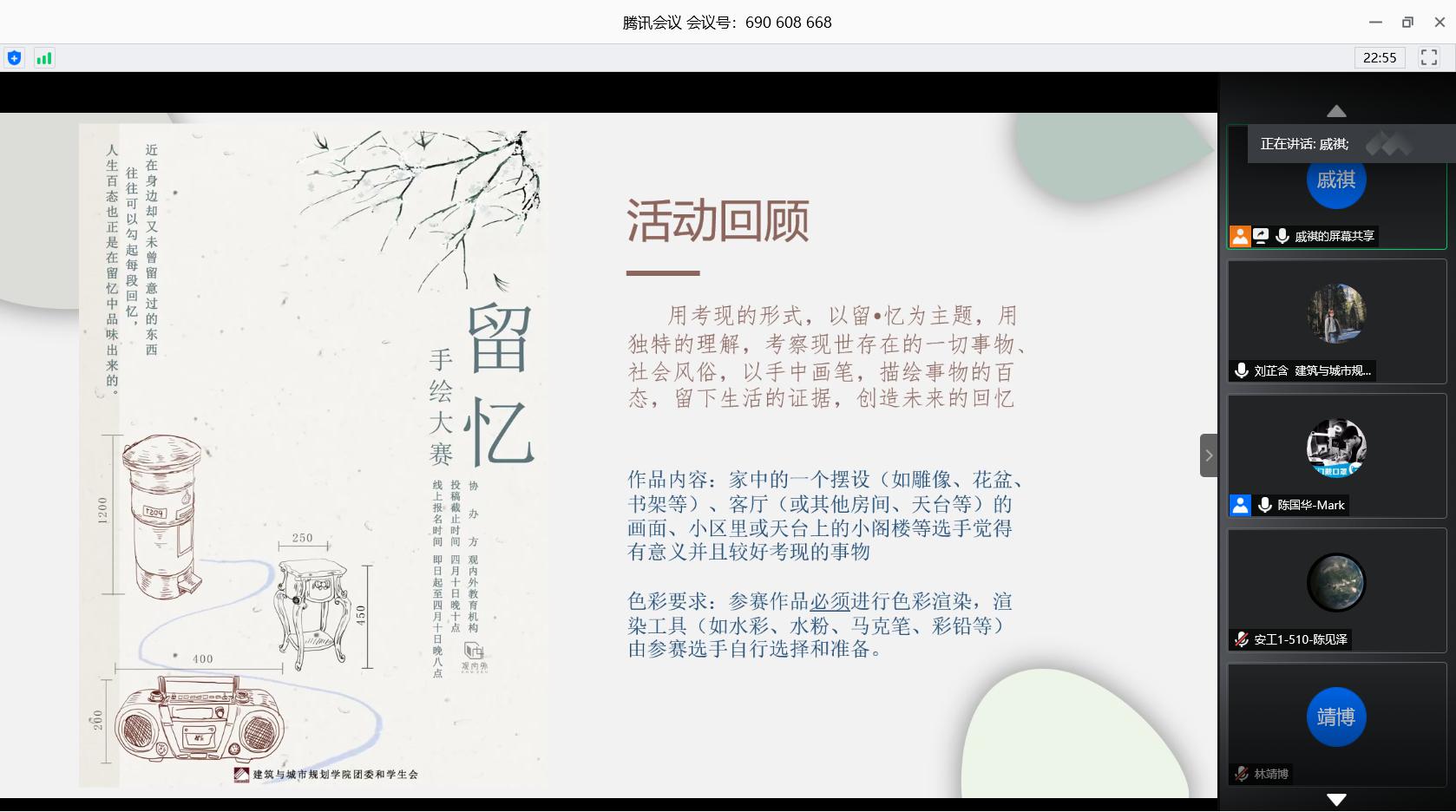 最后,学生会秘书长刘芷含老师总结发言。她高度赞扬了参赛者们能够克服重重困难积极参与,并认真学习“考现”这个新的表现形式,出色完成了这次手绘大赛。她表达了自己对比赛作品的感受,认为此次参赛作品时代感、历史感与趣味性并存,与往年作品相比,本届作品对主题的挖掘更具深度,表现技术有所提高。同时,她与参会师生分享了此次办赛、参赛的启示:一是每个人都应该勇于面对变化,视变化为机遇,及时调整状态应对;二是我们都应该沉心静气做事,挖掘自己更多的潜力,从而展现出更优的作品。