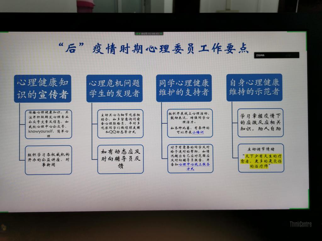 此次培训帮助心委们增强了专业技能,明确了疫情下的工作要点,方便在疫情期间更好地开展心理健康工作。