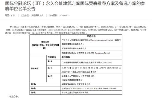 2019年9月23日,由广州市南沙新区明珠湾开发建设管理局、国际金融论坛(广州)有限公司共同组织的国际金融论坛(IFF)永久会址建筑方案国际竞赛第二阶段评审会在南沙拉开帷幕。自该竞赛正式启动以来,共吸引中外知名设计单位包括英国扎哈.哈迪德建筑事务所、奥地利蓝天组、日本株式会社佐藤综合计画、北京市建筑设计研究院有限公司、华南理工大学建筑设计研究院有限公司等54家报名参与。