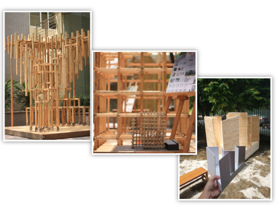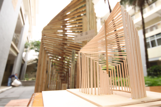 视频放映结束后,老师和选手们前往各队伍场地,答辩开始。答辩选手一边展示建筑体验,一边讲述作品的寓意以及搭建感受,尤其是搭建中出现的天气、材料、人员等各类困难,既是考验、又是挑战,是团队们在这次比赛中的深刻体验。其中,化缘和尚队——作品“捕蝉”的场地在室外,受自然环境和天气的影响较大,用电也更为艰难;五条发际线队——作品“待”则遇到结构问题,选手们体会到实体搭建与计划理想的出入,简化了结构并认真采取老师意见对结构进行加固;此外,其他队伍也都面临着施工误差与材料加工等问题。在选手们解说时,评委们也忍不住亲自体验作品,在各具特色的六个作品中体验、拍照。木构建筑特有的纹理颜色融合其极具张力的建筑造型,虚实相生间塑造出禅意,给予众人不一样的美的感受。