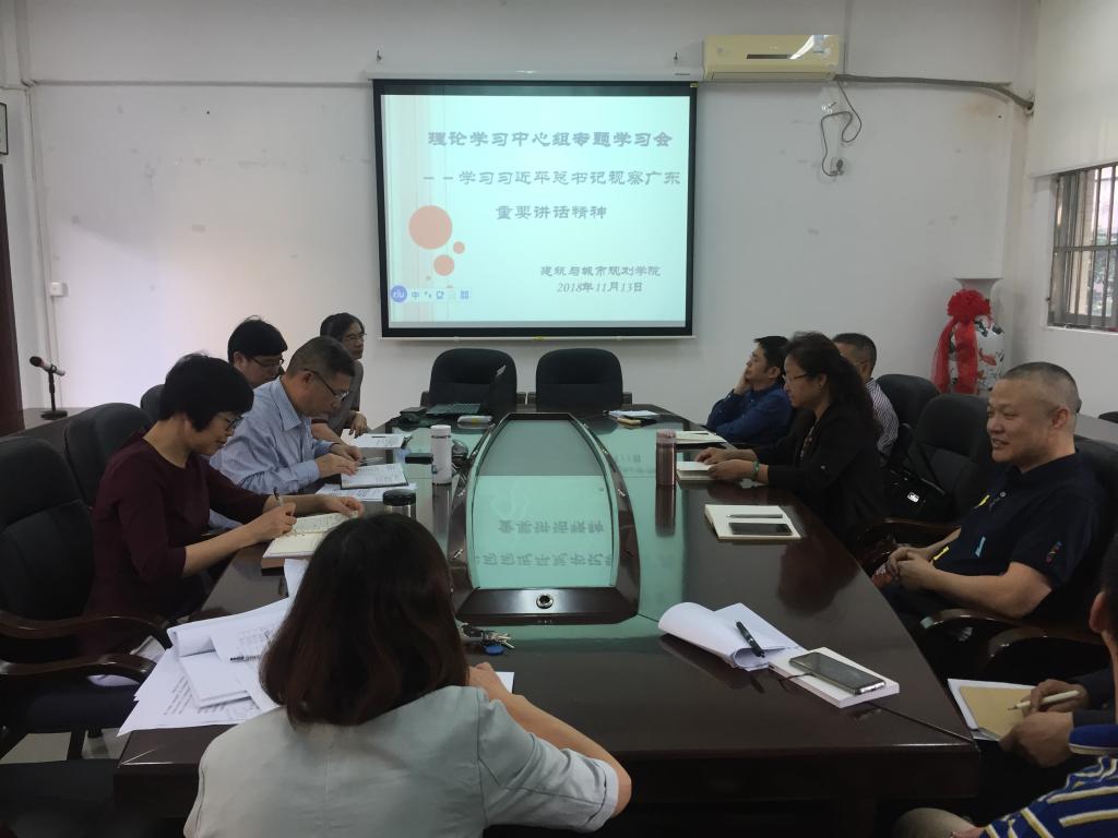 召开学院党委理论学习中心组会议,再次专题认真学习领会习近平总书记视察广东重要讲话精神并展开深入讨论。学院党委委员、建筑设计院院长、各教职工党支部书记参加了此次会议。会议由学院党委钟兆明书记主持。