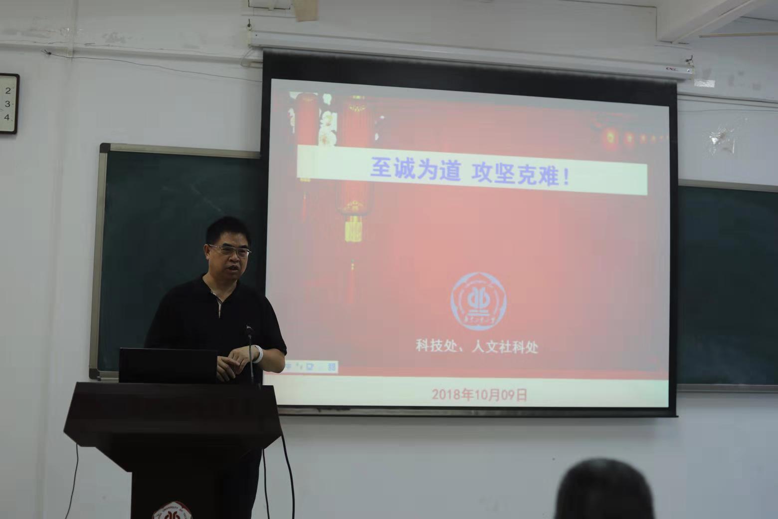 2018年国家社科基金的情况,并对2019年国家社科基金申报进行细致的讲解,他指出,学校完善的科研考核评价指标促进了学校科研的快速发展,高水平科研团队是建设高水平大学的抓手,要重视科研团队的建设,加强基础研究,促进学院学科发展,提升学院科研创新原创能力,推进高水平论文和科技成果的转化,为我校高水平大学建设贡献力量。