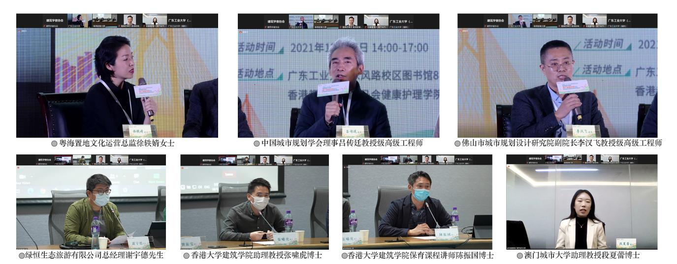 中国城市规划学会理事吕传廷教授在讨论中指出,非物质文化遗产是有生命力的,人类智慧创造出物质文明,物质载体反哺人类发展。香港大学建筑学院保育课程讲师、仰光遗产信托基金客席顾问陈振国博士就非遗项目中,如何找到经济效益与文化传承的平衡点提出自己的看法。香港大学建筑学院城市规划与设计系助理教授张啸虎博士以“数字敦煌”为例,表达了文化遗产保育可借助增强现实等高科技手段以丰富其形式、提升其价值。澳门城市大学国际旅游与管理学院助理教授段夏蕾博士以澳门学者身份也表达了对文化遗产旅游的重视,同时希望能和大湾区伙伴有更紧密的跨地域串联合作。佛山市城市规划设计研究院副院长李汉飞表示,非遗的挖掘、保育、活化应从大湾区整体层面着手,纳入相通的文旅体系。